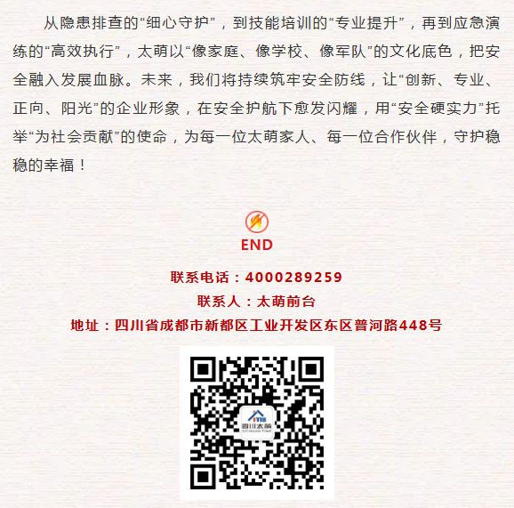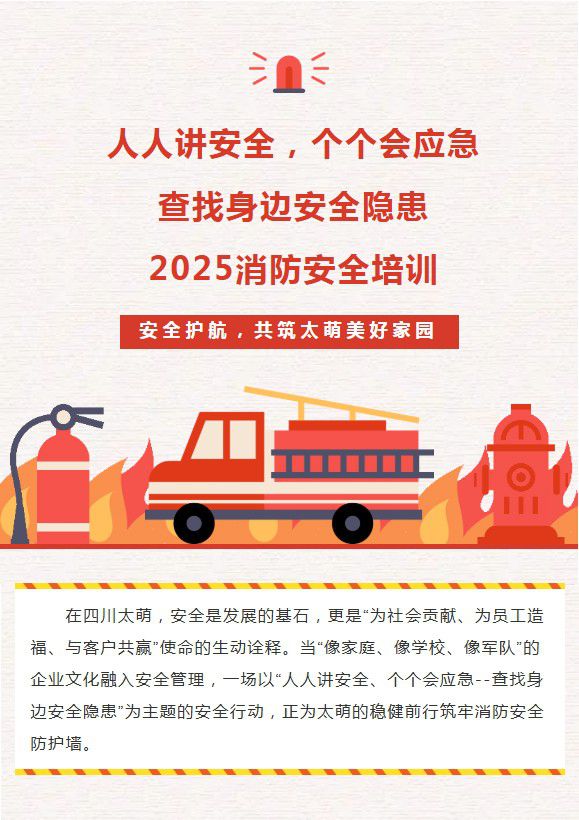 在四川太萌,安全是发展的基石,更是“为社会贡献、为员工造福、与客户共赢”使命的生动诠释。当“像家庭、像学校、像军队”的企业文化融入安全管理,一场以“人人讲安全、个个会应急--查找身边安全隐患”为主题的安全行动